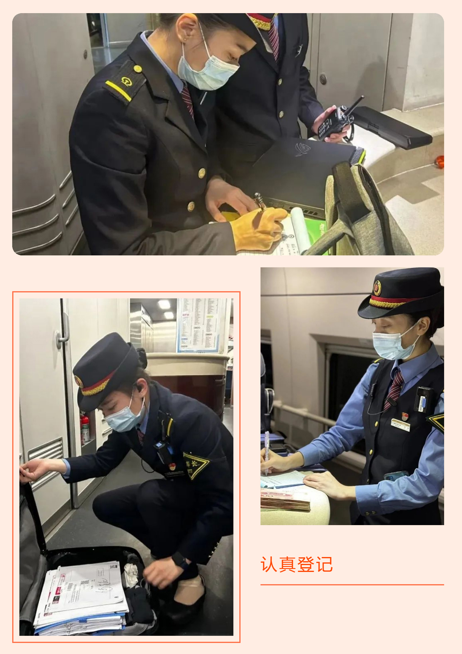 在值乘的旅途中,總是能拾到各式各樣的旅客遺失物品。每當(dāng)發(fā)現(xiàn)遺失物品時(shí),乘務(wù)員們會(huì)第一時(shí)間在K3執(zhí)法記錄儀的監(jiān)控下打開包裹,尋找失主的聯(lián)系方式,以最快的時(shí)間歸還遺失物,沒有找到聯(lián)系方式的按照規(guī)定做好登記,及時(shí)交予車站處置。同時(shí)根據(jù)遺失物品總結(jié)出易發(fā)生物品遺失的區(qū)段和人員,有針對(duì)性的進(jìn)行廣播宣傳,有效降低乘客遺失物品的幾率,降低乘客的財(cái)產(chǎn)損失,體現(xiàn)“人民鐵路為人民”的服務(wù)宗旨。